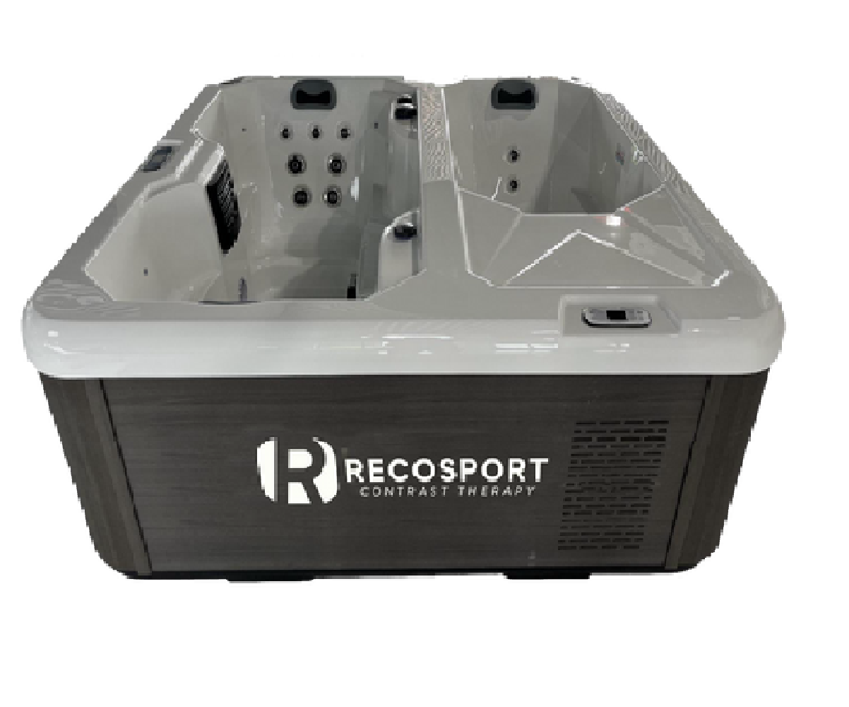 The acrylic contrast therapy pool combines cold and hot water zones, with temperature control between 3–40°C. It includes a 1 HP chiller, circulation pump, ozone disinfection, LED lighting, jets, filtration system, and a thermal insulation cover. WiFi connection via the Tuya app allows easy monitoring and control, making it ideal for professional recovery.