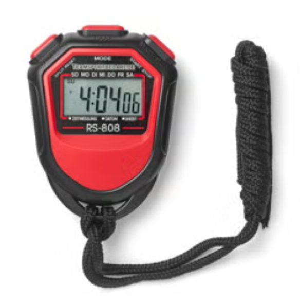 Modern digital stopwatch with extra-large display and neck strap.The digital stopwatch features many useful functions such as 1/100 second display, 12/24h time format, extra-large screen, alarm function, etc. It is versatile, splash-resistant, and easy to use. The battery compartment on the back can be easily opened even without a screwdriver.