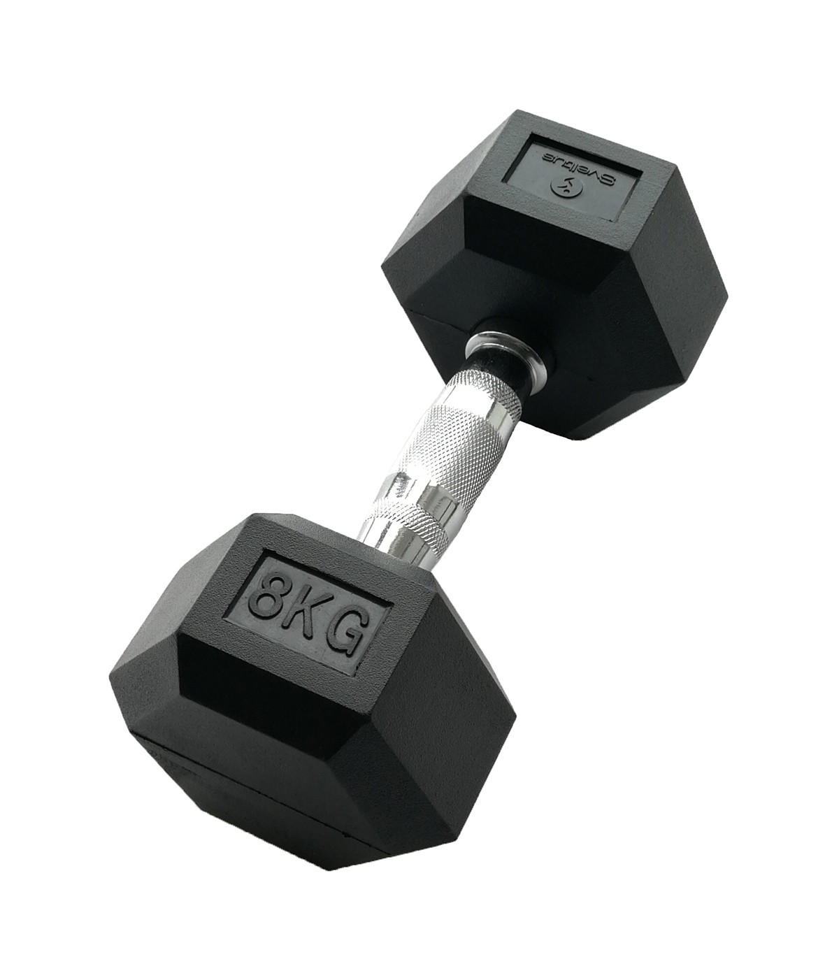 Its hexagonal shape prevents it from rolling (6 sides). It is covered with a highly resistant and durable layer of rubber that protects it from shocks and minimizes noise. The chrome ergonomic handle has a non-slip zone for a perfect grip.